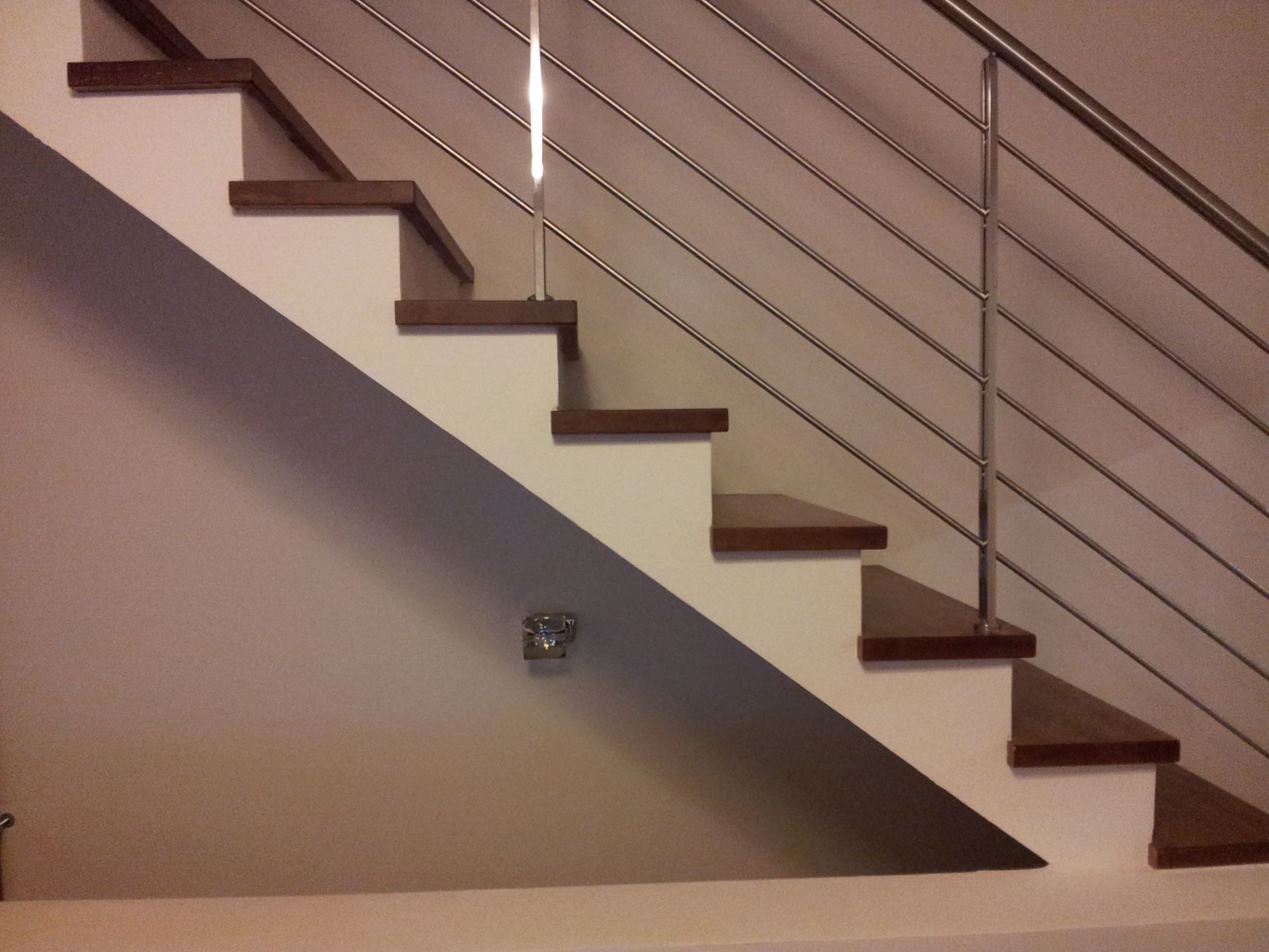 Ringhiere moderne con montanti verticali in acciaio verniciato alle polveri di colore bianco, grigio, nero, tortora e bronzo, 6 filoncini orizzontali in acciaio inox diametro mm. 6 o 12 e corrimano in acciaio verniciato, inox o in legno.