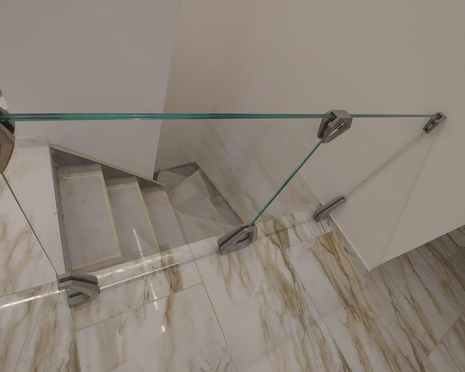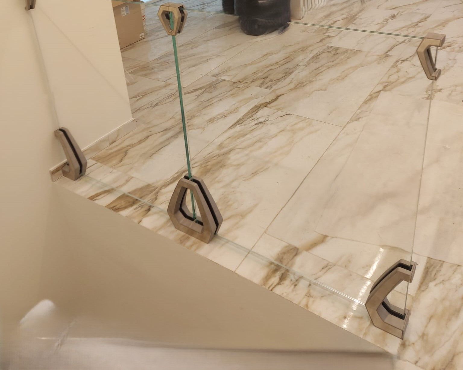 Ancoraggio possibile sia tramite rotules in acciaio inox sulla muratura, che tramite pinze reggi vetro o profili in alluminio/acciaio eventualmente a scomparsa nel pavimento.