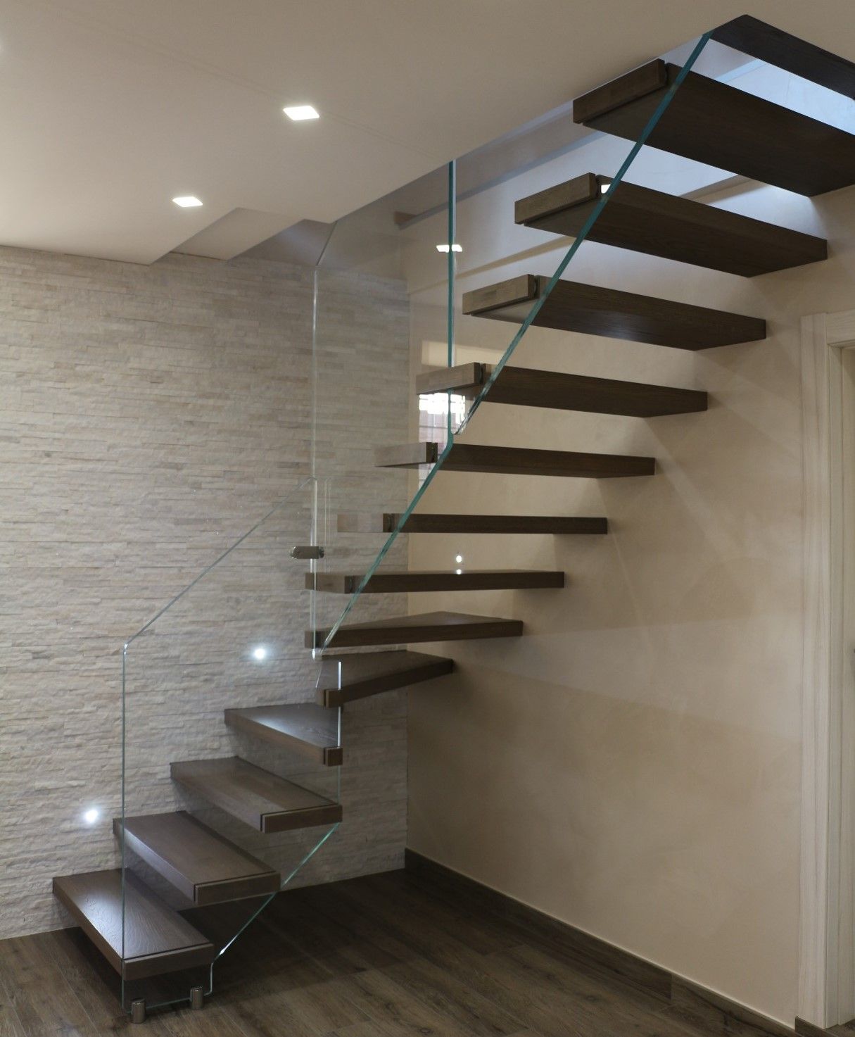 La richiesta iniziale del cliente era quella di realizzare una scala a sbalzo con gradini ancorati direttamente a parete e ringhiera in vetro.