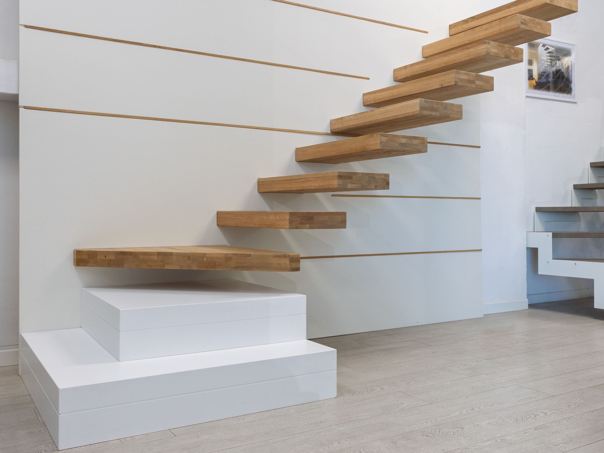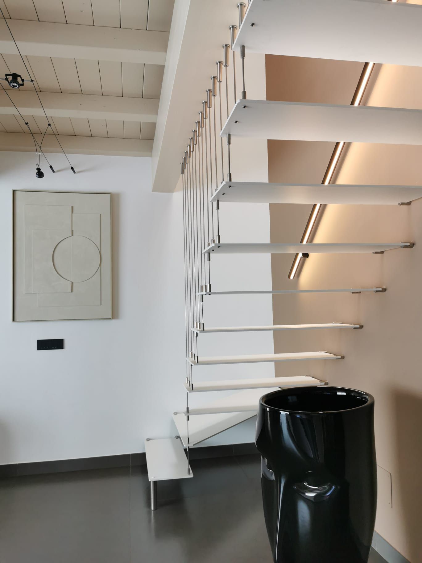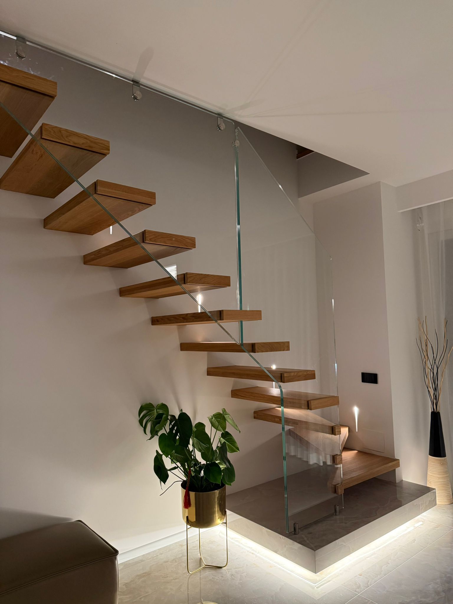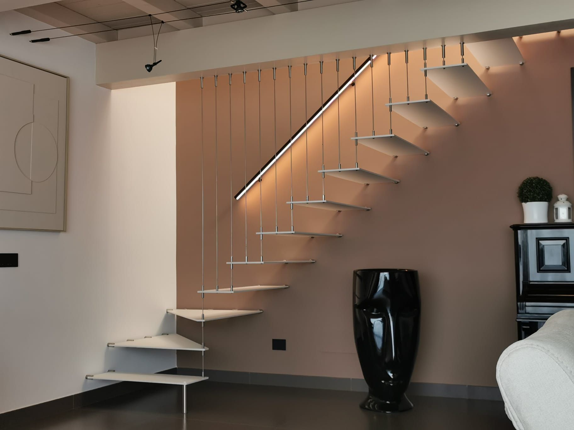 Scale da interno sospese su misura di diverse tipologie: scale a sbalzo senza ringhiera o con ringhiera coadiuvante in vetro o in acciaio che ne permette l’installazione su qualsiasi tipo di parete di almeno 8 cm.