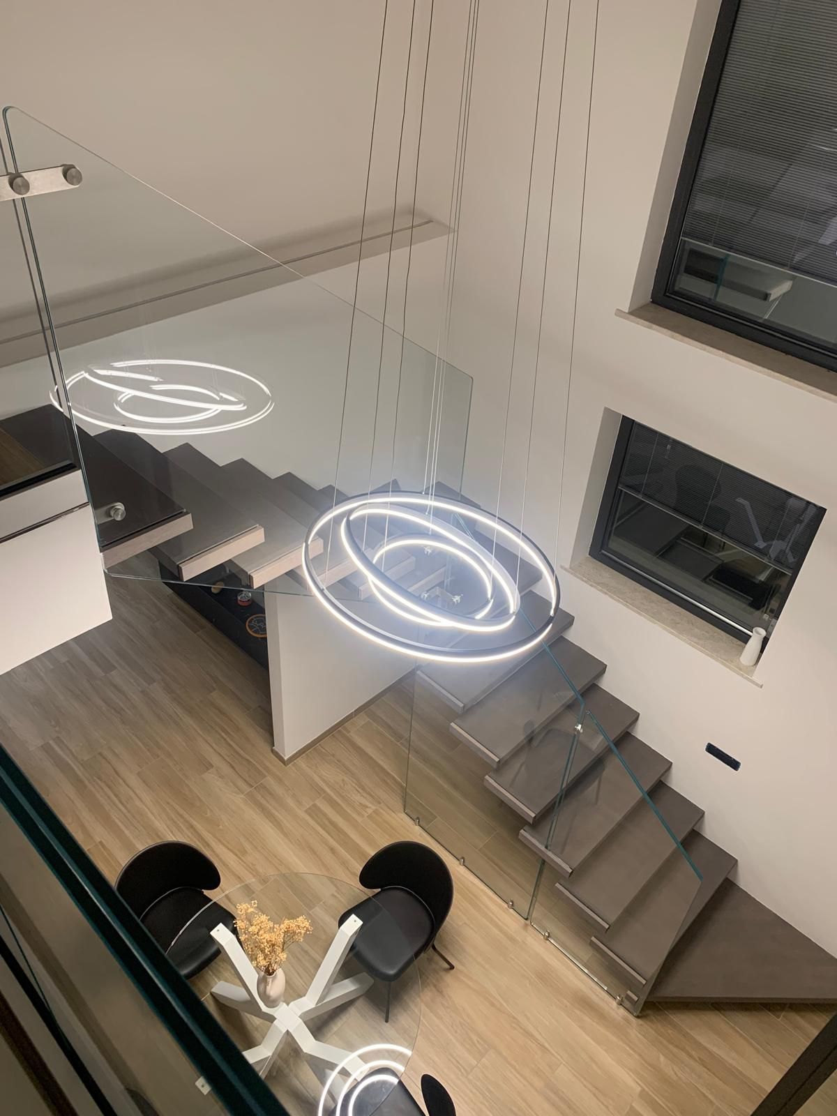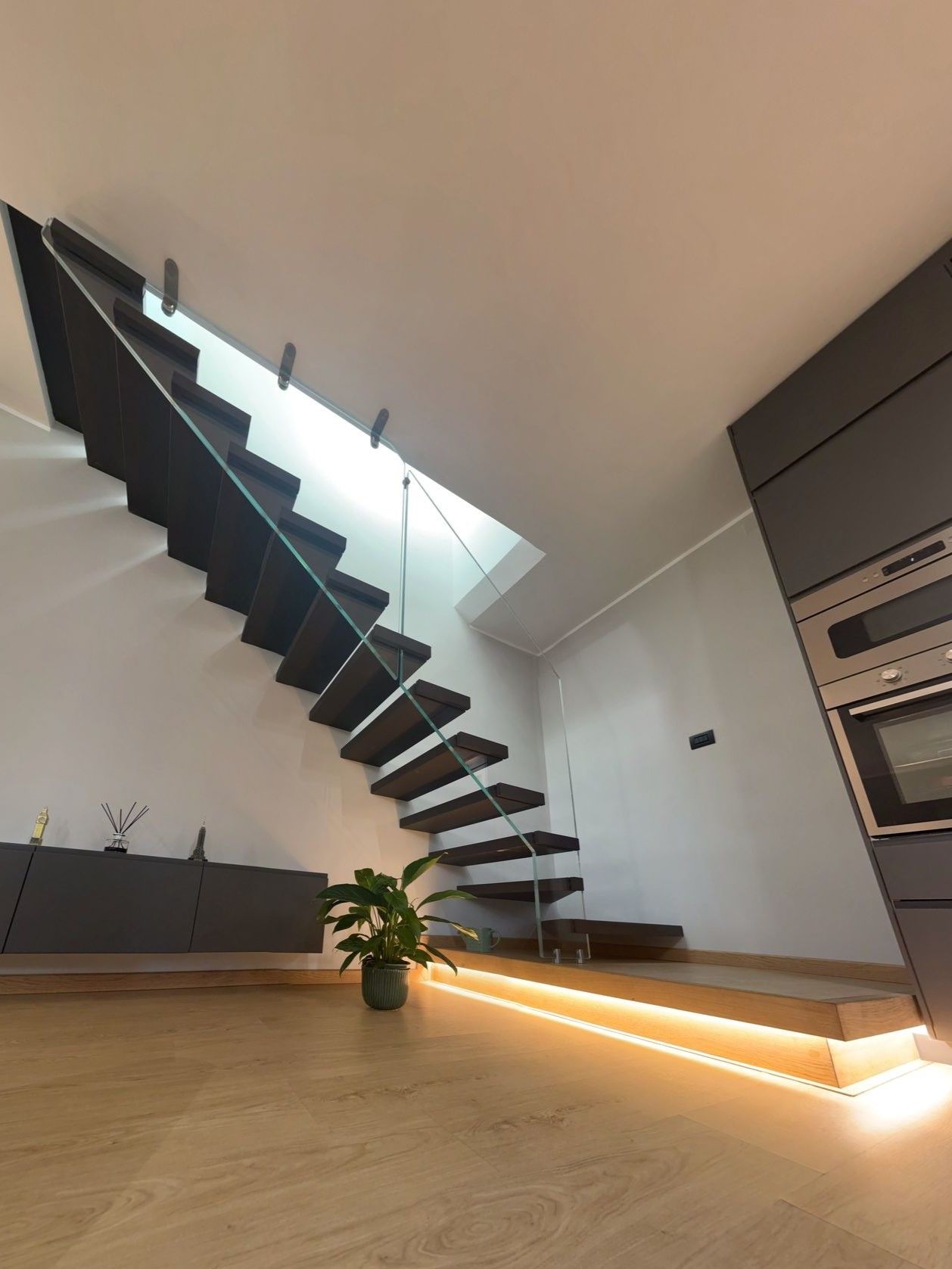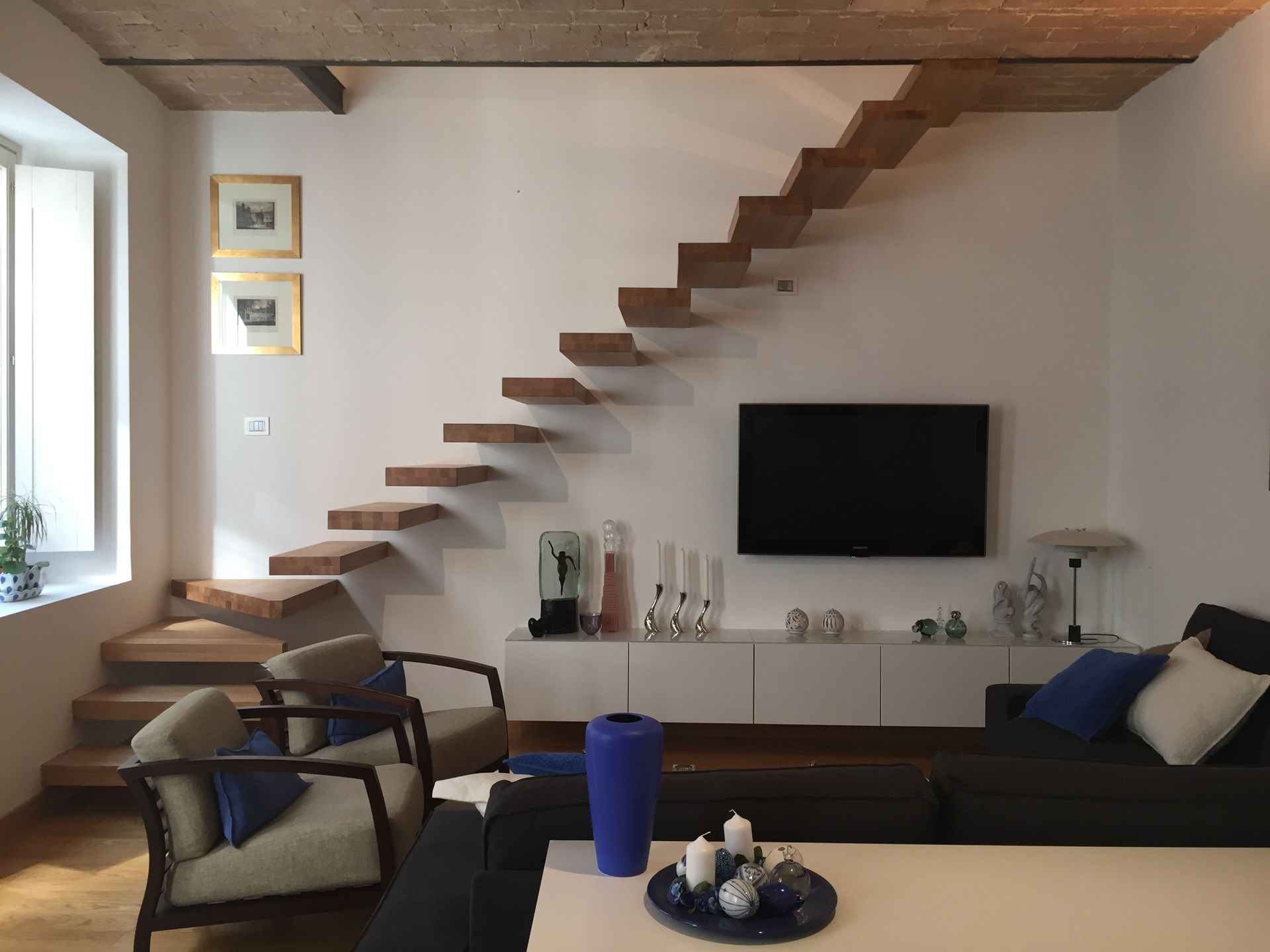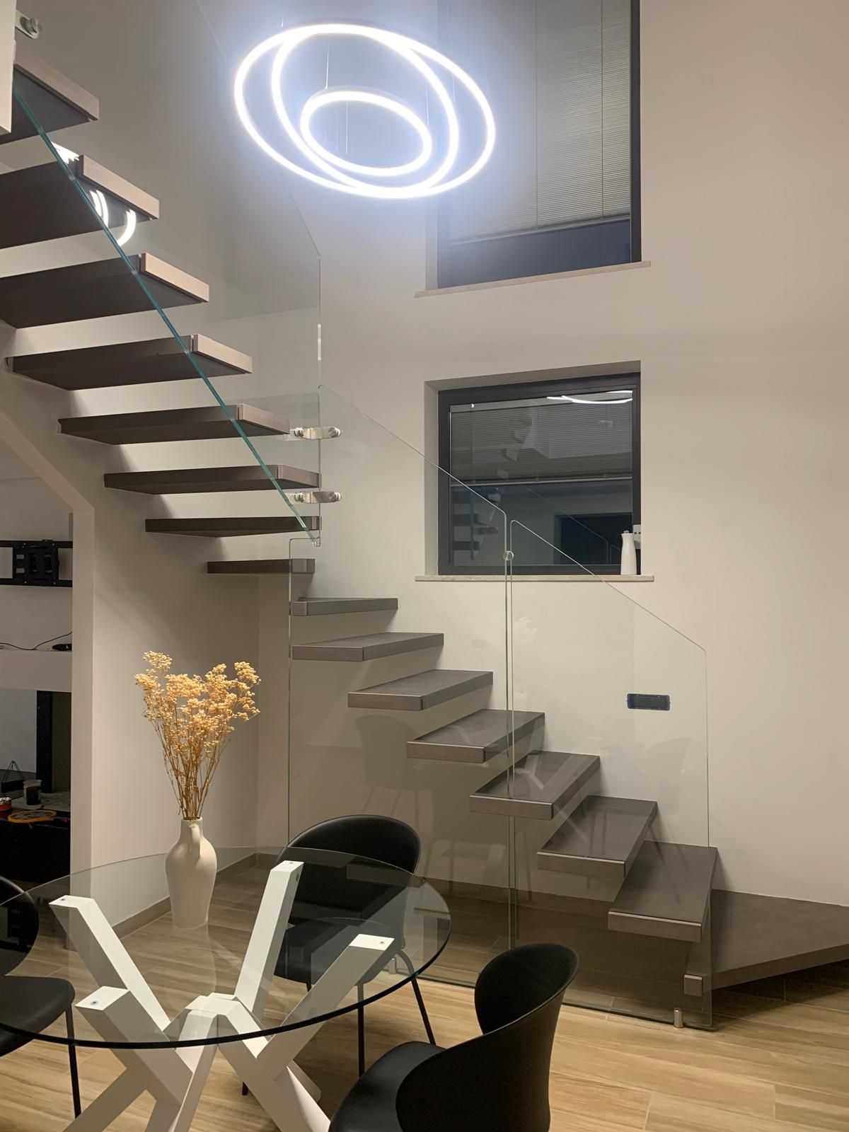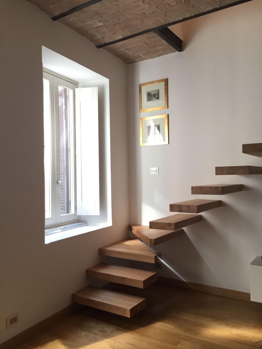 Scale da interno sospese su misura di diverse tipologie: scale a sbalzo senza ringhiera o con ringhiera coadiuvante in vetro o in acciaio che ne permette l’installazione su qualsiasi tipo di parete di almeno 8 cm.