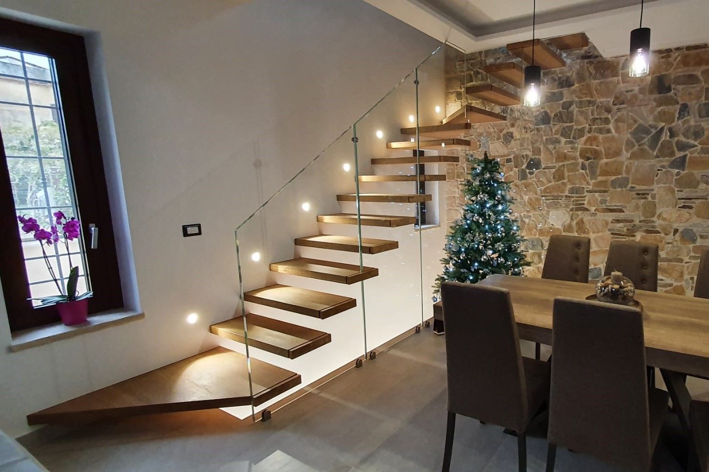 Gradini inseriti direttamente a parete, tramite un particolare sistema di fissaggio gradini che le permette, grazie anche alla ringhiera in vetro strutturale, di essere installata su qualsiasi tipo di parete con spessore minimo 8 cm.